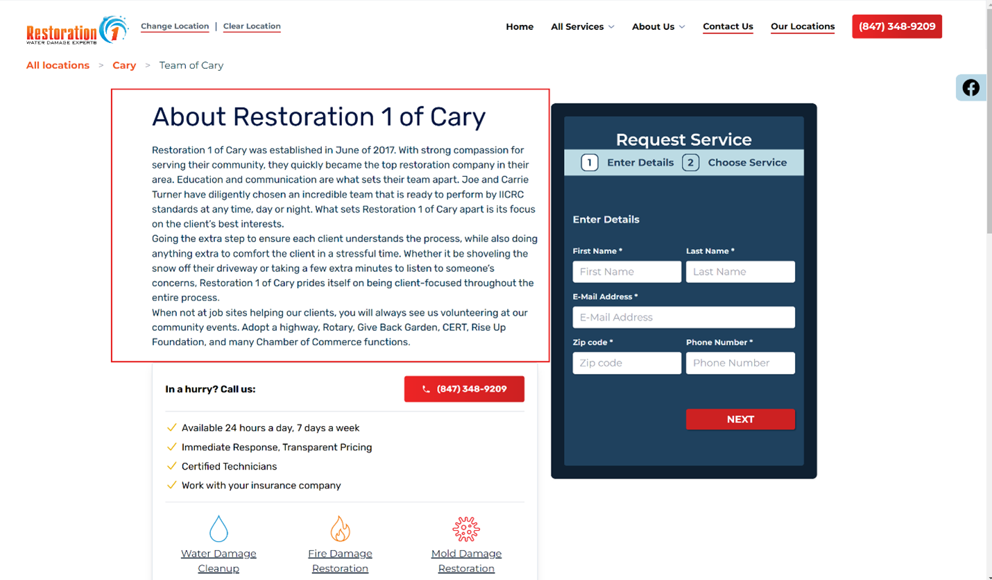 - Example URL: https://restoration1.com/cary/your-local-team